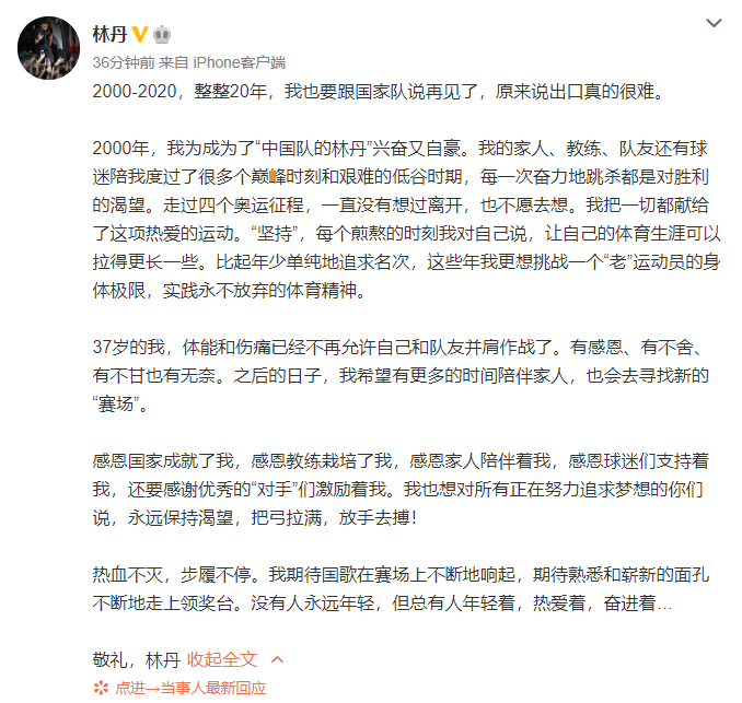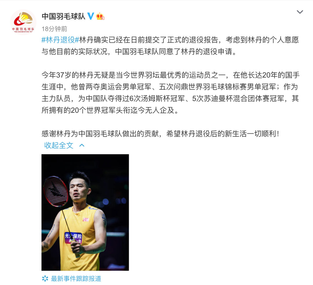 林丹发文称,由于体能和伤痛已不再允许自己和队友并肩作战。之后的日子,希望有更多的时间陪伴家人,也会去寻找新的“赛场”。