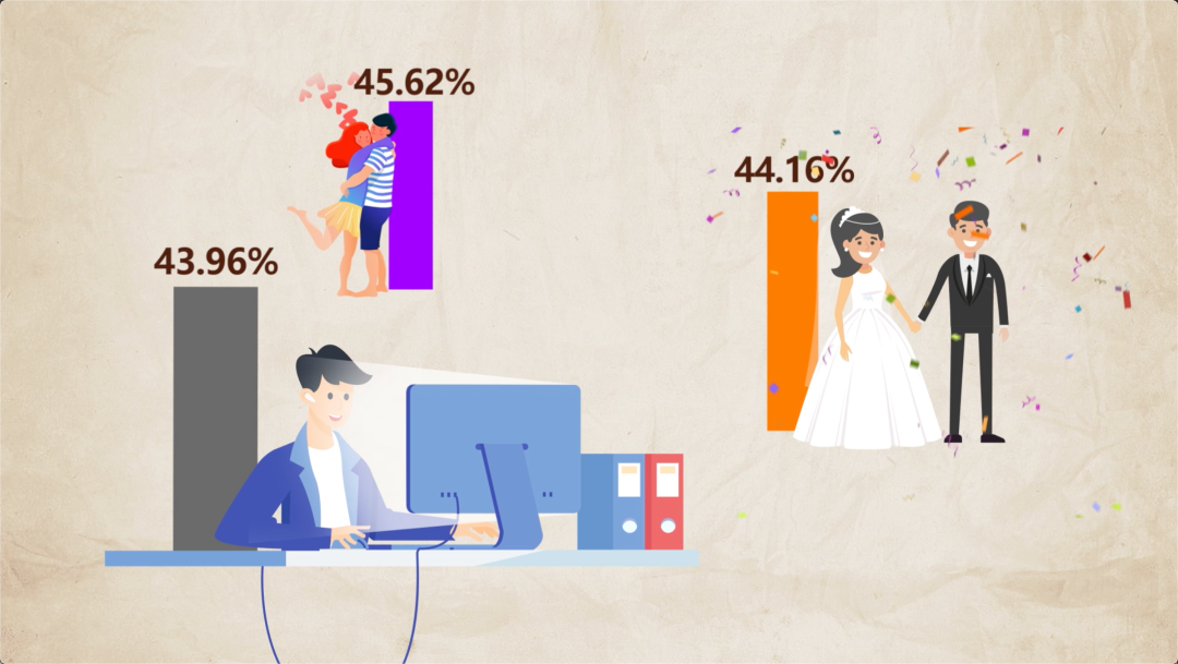 从情感关系看,幸福感比例最高,是有恋人但还没结婚的人们(45.62%),其次是已婚人士(44.16%),显然有伴侣的人群更幸福。排名第三的是单身人士(43.96%),赶紧去谈场恋爱吧。