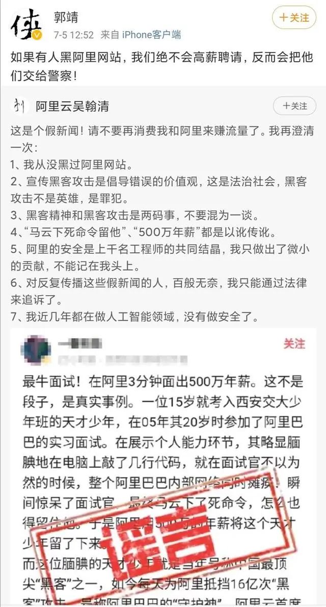 7月5日,网络盛传的“阿里天才黑客”吴翰清通过微博辟谣:“我从没黑过阿里网站,‘马云下死命令留我’、‘500万年薪’都是以讹传讹的假新闻。”