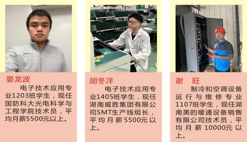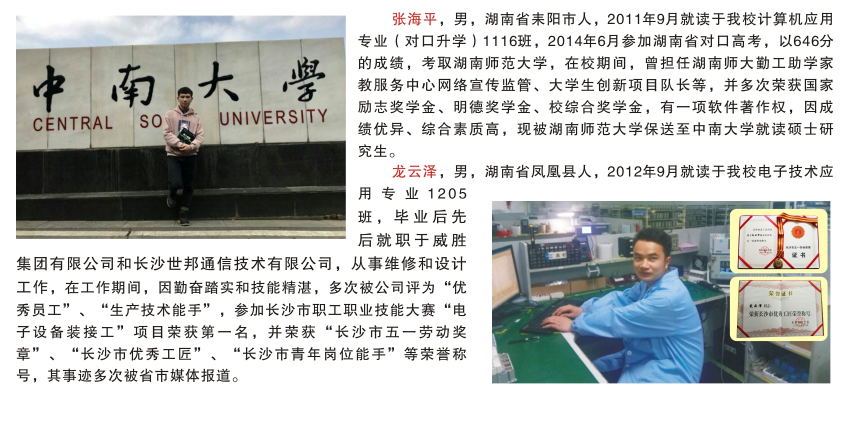 培养目标:学生通过全省对口高考或高职院单招两种方式,可以就读湖南师范大学、湘潭大学、湖南农业大学、湖南工业大学、邵阳学院、湘南学院、长沙师范学院、湖南铁道职业技术学院、湖南机电职业技术学院、湖南生物机电职业技术学院、湖南交通职业技术学院、湖南工业职业技术学院、长沙航空职业技术学院等60余所本、专科院校。