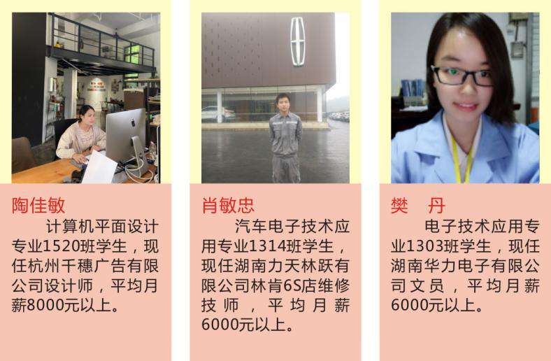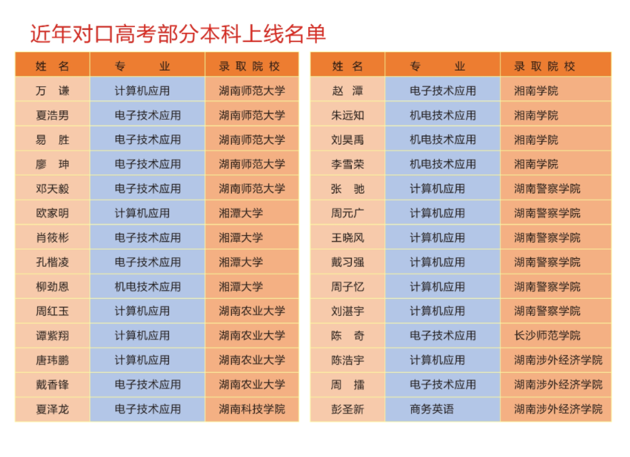培养目标:学生通过全省对口高考或高职院单招两种方式,可以就读湖南师范大学、湘潭大学、湖南农业大学、湖南警察学院、湖南文理学院、湖南科技学院、湘南学院、湖南铁道职业技术学院、湖南大众传媒职业技术学院、湖南工业职业技术学院、湖南安全技术职业学院、湖南科技职业学院、湖南信息职业技术学院等70余所本、专科院校。