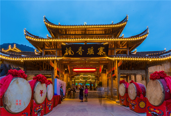 枫香瑶寨位于湖南省怀化市溆浦县统溪河镇,坐落于诗溪江大峡谷左岸,响水洞左侧。枫香坪峭壁顶端,呈金斗金盆状,是一家集农耕文化博物管、文体广场游、餐饮、会议、住宿、健身、棋牌娱乐为一体的休闲避暑度假山庄。总面积120余亩,由三栋木质大楼和一条文化长廊形成四合院结构,其中拥有客房41间,有2个多功能厅集餐饮会议于一体,还设有花瑶商铺、特产商店,供游客所需并带回去与家人朋友分享。