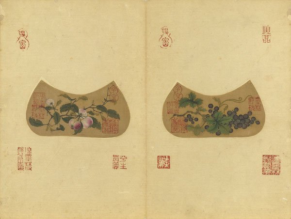 马远《小品》册图绘茶花、牡丹、葡萄、桃实,设色浓丽,用笔极精,花叶脉络丝毫不茍。画心作独木舟式,装池形式别致。另两开山水人物,绘山阁对坐,策杖登高,水上乘舟,具有清旷脱凡的风韵。此册画无名款,被归于马远(活动于1180-1224)名下。画幅虽小,然构图布局呈现画家风格特色。本幅选自宋马远《小品》册第四、五、六、七开。