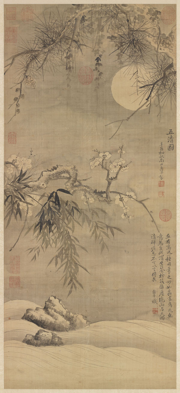 恽寿平(1633-1690),初名格,字寿平,号南田,江苏武进人。擅画山水,专攻花卉草虫,以“没骨法”参以己意,独创写生风格,为清代最出名的花卉画家。此次展出的《五清图》轴全幅笔墨多变,枯干焦浓,先浓后淡,墨趣丰饶独具特色,富有高雅脱俗的气质。“五清”指的是松、竹、梅、水、月,比喻君子品格坚贞,清高不俗的情操。款识“辛酉”,时年四十九岁。