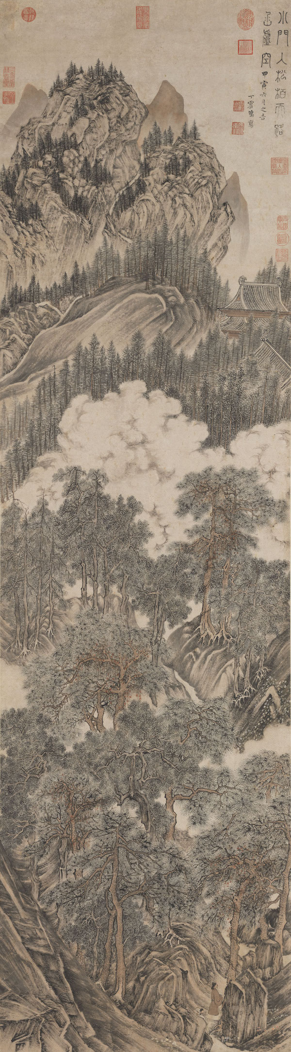 《松巅函虚》轴绘松岩小径,士人携童漫步行吟。松岩之上,大片云头隔断,云外松杉密集,林梢露出寺宇。横石结构甚简,其上结顶一峰,则石棱繁复,结构极密。全画善于繁中用简,繁密中自有奇趣。作于万历四十二年(1614),时年六十八岁,是丁云鹏山水画中精品。丁云鹏(1547或1548-1629后),字南羽,号圣华居士,安徽休宁人。善画佛道人物,为晚明大家。