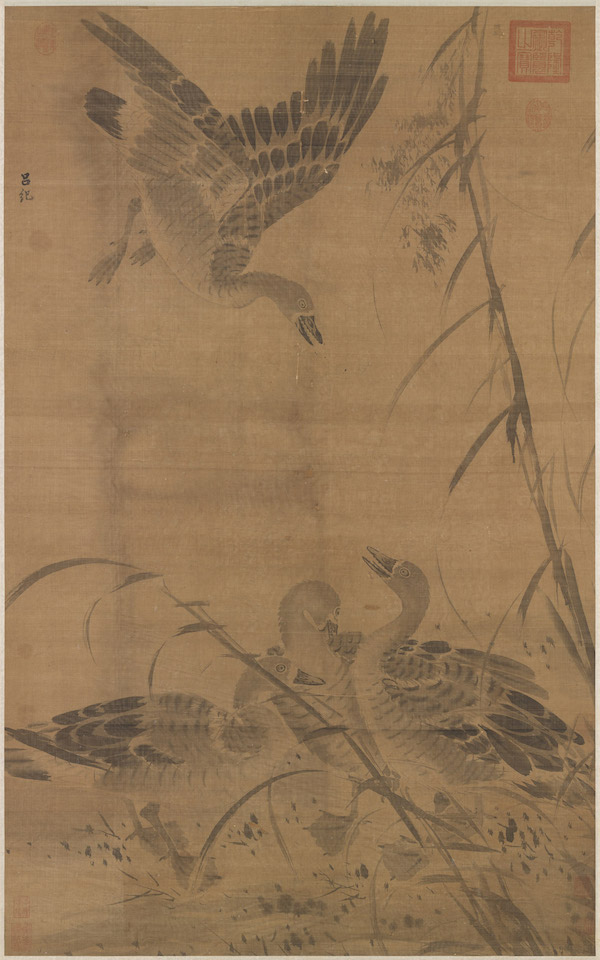 吕纪《芦汀来雁图》轴画秋雁两双,飞鸣于苇塘沼泥之中,一飞降,一仰首,与栖息二雁颇有呼应。吕纪(活动于1475-1503),字廷振,浙江鄞县(今宁波)人。本幅“吕纪”款疑似后加,幅右下有“字以善”印,是林良字,本幅画风亦相近。林良(约1428-1494前)于明孝宗弘治(1488-1505在位)间值仁智殿,官至锦衣卫指挥,与吕纪先后供奉内廷。