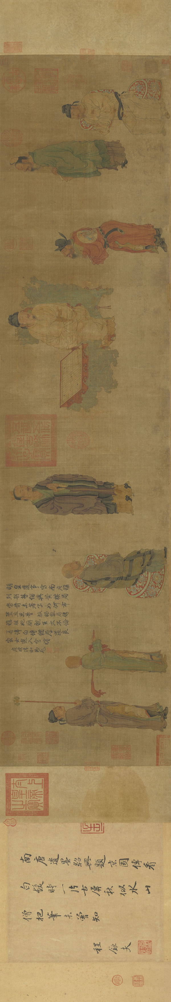 其中周文矩《画明皇会棋图》描写唐代宫廷的围棋活动,玄宗坐龙椅,前置棋盘,另有官员、和尚道士和侍从内官观棋。红衣人趋前论事,袍服背后为丑角图像,应为优伶。乾隆诗评明皇纵容杨贵妃,任其由宠犬搅乱棋局,是日后政局紊乱祸因。全卷设色淡雅,衣纹线条细腻,人物表情生动。画无名款,旧传为南唐周文矩(活动于西元10世纪)所作,但从画风看,与元任仁发(1255-1327)更为接近。