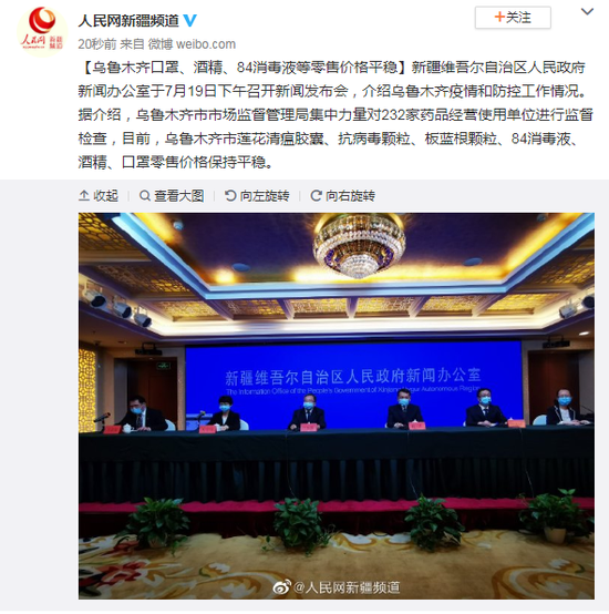 新疆维吾尔自治区人民政府新闻办公室于7月19日下午召开新闻发布会,介绍乌鲁木齐疫情和防控工作情况。据介绍,乌鲁木齐市市场监督管理局集中力量对232家药品经营使用单位进行监督检查,目前,乌鲁木齐市莲花清瘟胶囊、抗病毒颗粒、板蓝根颗粒、84消毒液、酒精、口罩零售价格保持平稳。