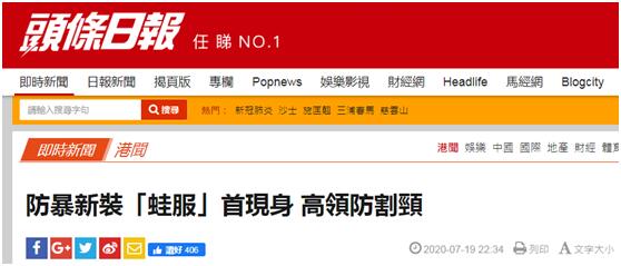 报道提及,“蛙服”是由香港一家公司供应,根据该公司网页数据介绍显示,其防护服装是香港设计,首批已分发给各大总区应变大队第一及第二梯队人员,每人获发一套“蛙服”、再加上原有两套“韩国仔”交替使用,但出勤时要确保整队人员穿上同一款制服。至于其余装备如战术背心等,警方仍在物色改良版本。