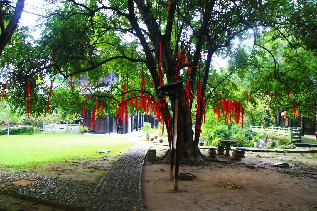 半月亭旁的大树名曰豹皮黄药楠,树根部萌发五棵小树,将古树环绕,故又名“五子登科”树,极为神奇。