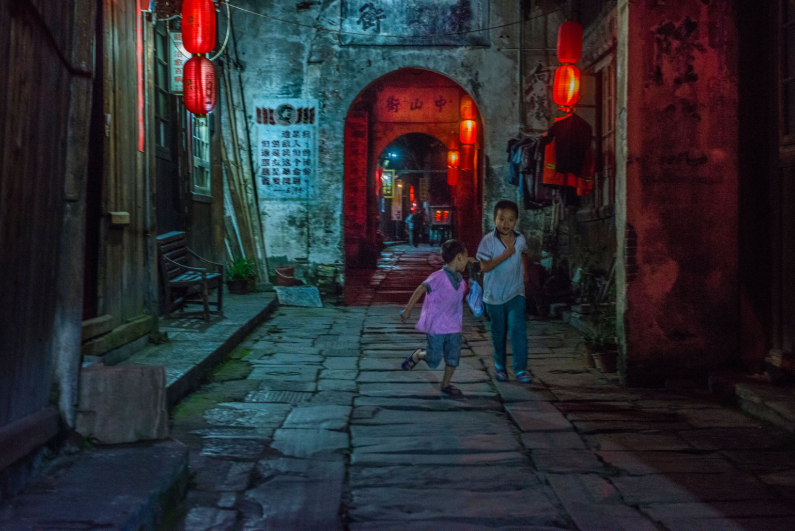 孩童嬉戏,老者闲谈