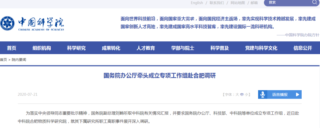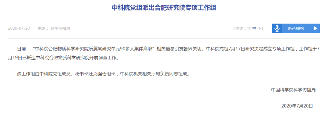 昨天下午,中国科学院发布消息,日前,“中科院合肥物质科学研究院所属某研究单元90多人集体离职”相关信息引发各界关切。中科院党组7月17日研究决定成立专项工作组,工作组于7月19日已抵达中科院合肥物质科学研究院开展调查工作。该工作组由中科院党组成员、秘书长汪克强任组长,中科院机关相关厅局负责同志组成。