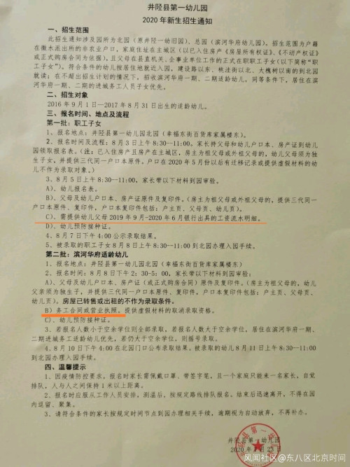 7月28日,有网友在百度贴吧“井陉吧”上晒出该县第一幼儿园2020年新生招生通知。