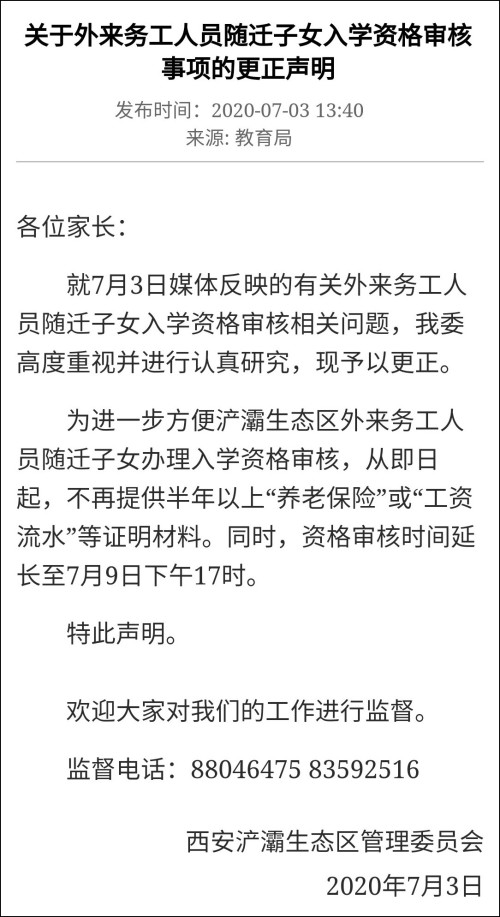 经媒体报道周知后,西安市浐灞生态区管委会7月3日表示,即日起,外来务工子女入学不需要提供半年以上社保或工资流水证明。