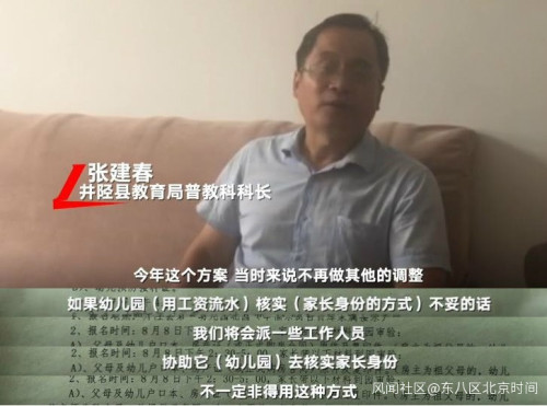 30日下午,井陉县教育局普教科科长张建春在接受新京报《紧急呼叫》的采访时表示,暂时不会对上述文件作出调整,“如果幼儿园(用工资流水)核实(家长身份的方式)不妥的话,我们会派出一些工作人员协助它去核实家长身份,不一定非得用这种方式。”