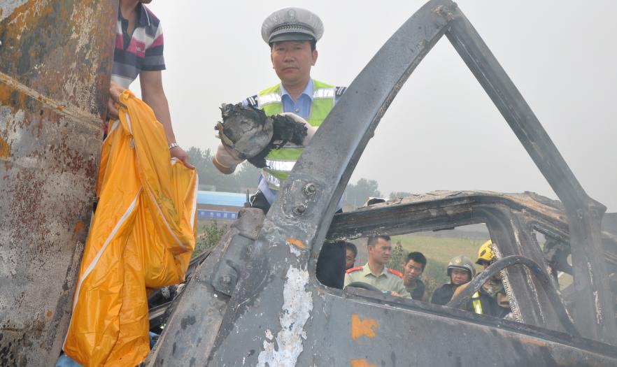 距离事发地越来越近,洪德国看见夜色中的滚滚浓烟;空气中,车辆燃烧后的化学气味和烧焦的味道混合在一起,被湿热的微风送进鼻腔。事故民警先一步到达现场,已经拉好警戒线,地面上铺着一张巨大的塑料薄膜,上面摆放着一具已经辨认不出人形的尸体。