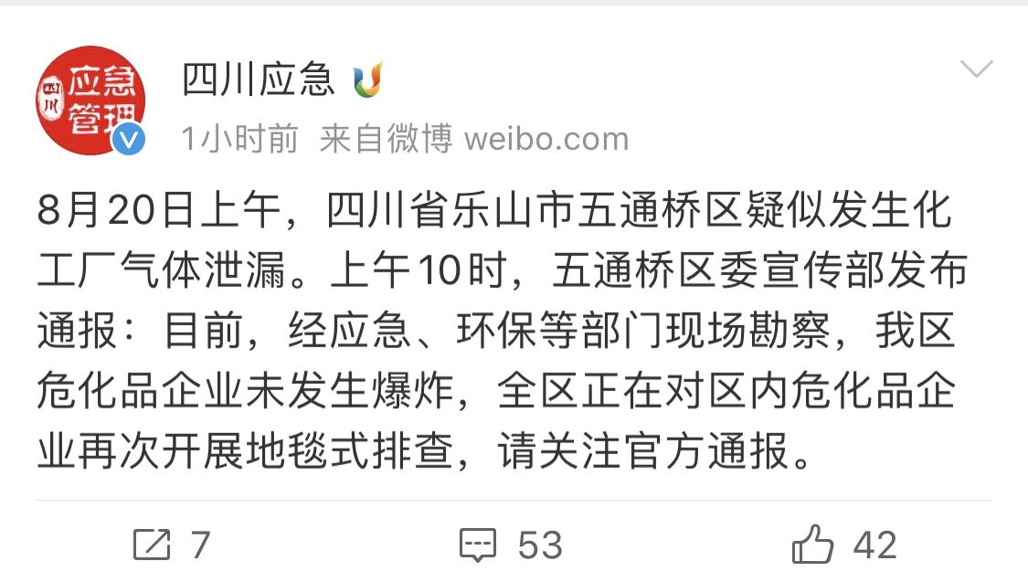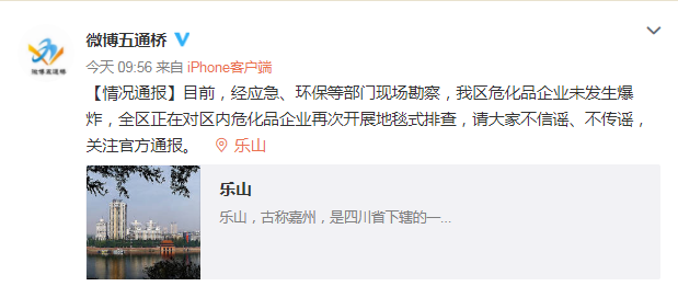 9:56,五通桥区发布通报:目前,经应急、环保等部门现场勘察,我区危化品企业未发生爆炸,全区正在对区内危化品企业再次开展地毯式排查,请大家不信谣、不传谣,关注官方通报。
