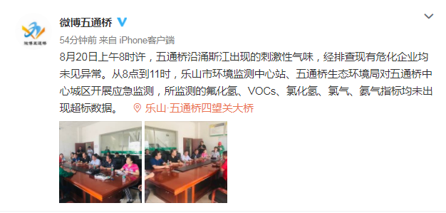 据四川省乐山市五通桥区官方微博消息,针对乐山五通桥出现刺激性气味事件,8月20日13时许,五通桥区委书记张国清发声。