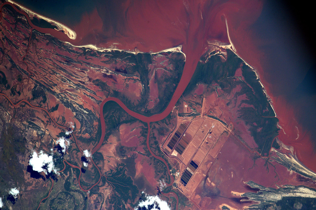 这是马达加斯加共和国一个名叫巴萨兰皮的沿海小镇。由于承载着大量富含铁的沉积物,镇上的桑包河就像大地的血管一样,载着橙红色的淤泥曲折汇入海洋,就连入海口也沾染了血色。一幅绮丽甚至有些凄美的景观就这样出现了:马达加斯加平原与印度洋海水融为一体,构成了华美、浓烈的色彩碰撞。