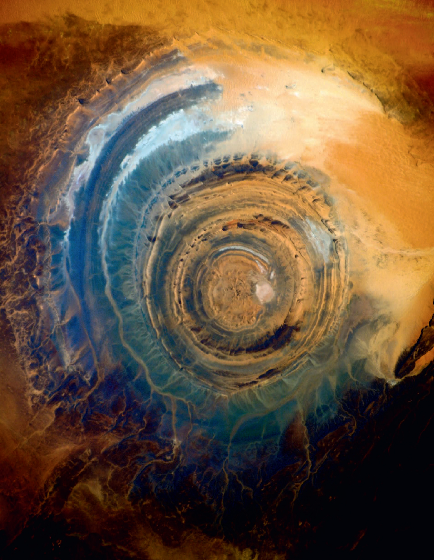 “非洲之眼”,又被称为“理查特结构”,位于撒哈拉沙漠西南部的毛里塔尼亚境内。它是全球十大最壮观的地质奇迹之一,呈现出一个巨大的同心圆结构,直径长达近50千米,也正是因此,只有身处太空的宇航员才能看到这一奇观的全貌。在托马眼中,它就像是一只睁得圆溜溜的眼睛,和太空中的他相互对望。在广袤的沙漠之中,它还可以帮助托马进行定位。