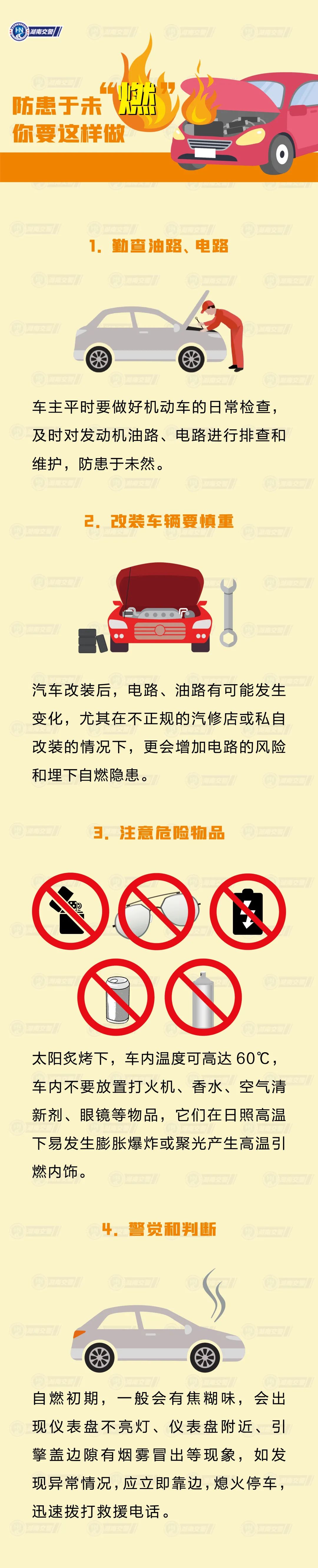 交警特别提醒:车辆自燃不仅会对爱车造成损害,甚至会危及到自己和他人的安全。夏季是汽车自然的高发期,请做好汽车保养和检查,疫情期间长期停放车辆要特别注意。