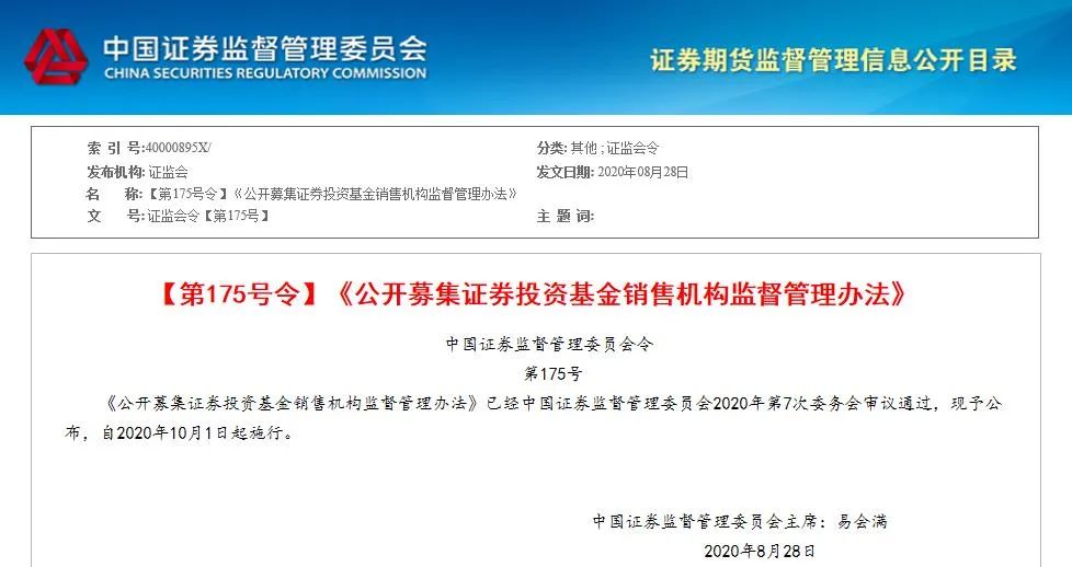 证监会近日发布《公开募集证券投资基金销售机构监督管理办法》及配套规则,自2020年10月1日起施行。