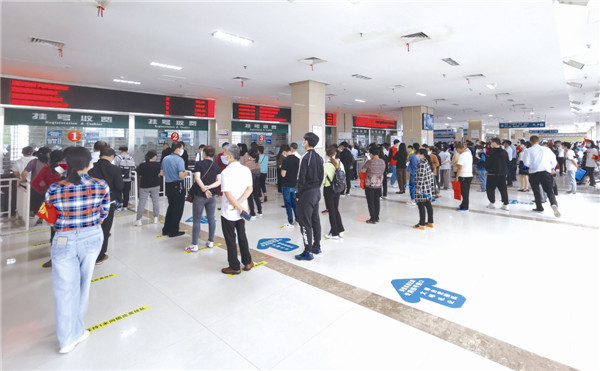 市人民医院6个挂号收费窗口前市民有序排队。