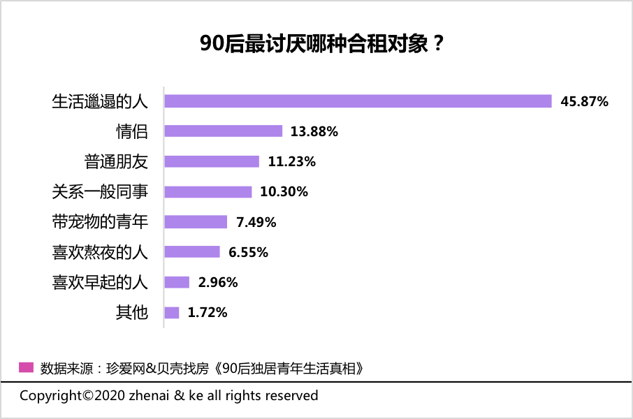 需要指出的是,独居,不仅指独身一人生活在一套房子内,也包括与陌生人合租零沟通式的隐性独居生活,调研发现,有14.3%的90后青年们正处于合租隐性独居生活状态。在合租对象的选择方面,90后青年群体倾向与熟悉的朋友或同事共同租房,最不能接受与生活习惯邋遢的人一起合租,占比达45.87%,其次是不愿意和情侣合租。