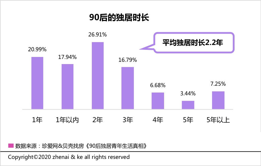 无论或主动或被动,大多数青年群体正感受着独居。贝壳研究院调查数据显示,90后这一代人中近8成曾有过独居生活经历(包括独自居住、与陌生人合租零沟通式隐形独居)。从独居时长看,90后青年平均独居时长为2.2年,其中独自一人生活3年及以上的比例达到34.16%。
