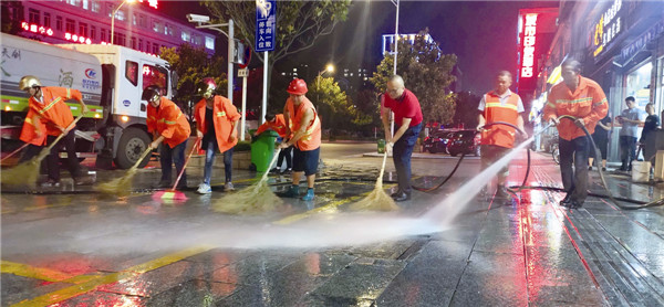 22时许,在市人民医院附近记者看到,市市容环境卫生维护中心主任肖村安手拿水管正在清洗地面,忙得不亦乐乎。一辆小型高压洒水车缓缓行驶,几名拿着扫帚、毛刷的环卫工人紧随其后。他们清扫完路面垃圾,再用高压水龙头细心冲洗人行道上的污垢灰尘,随后将污水扫至排水口、将收集的垃圾运走,一段一段将路面清扫得干干净净。