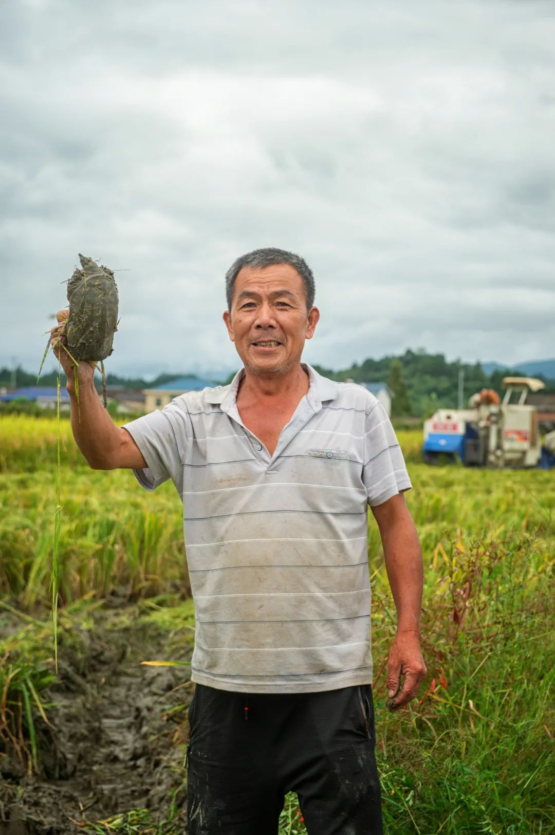 “这有个甲鱼,莫压坏了。”9月20日,在达浒镇金石村的稻田里,孔祥双的声音从不远处传来,他正在收割水稻。而站在田埂上的孔蒲中急忙踢开脚上的凉鞋,一路小跑,从泥地里翻出了一个手掌两倍大小的甲鱼,笑着说,“一个也能卖一百多元呢。”