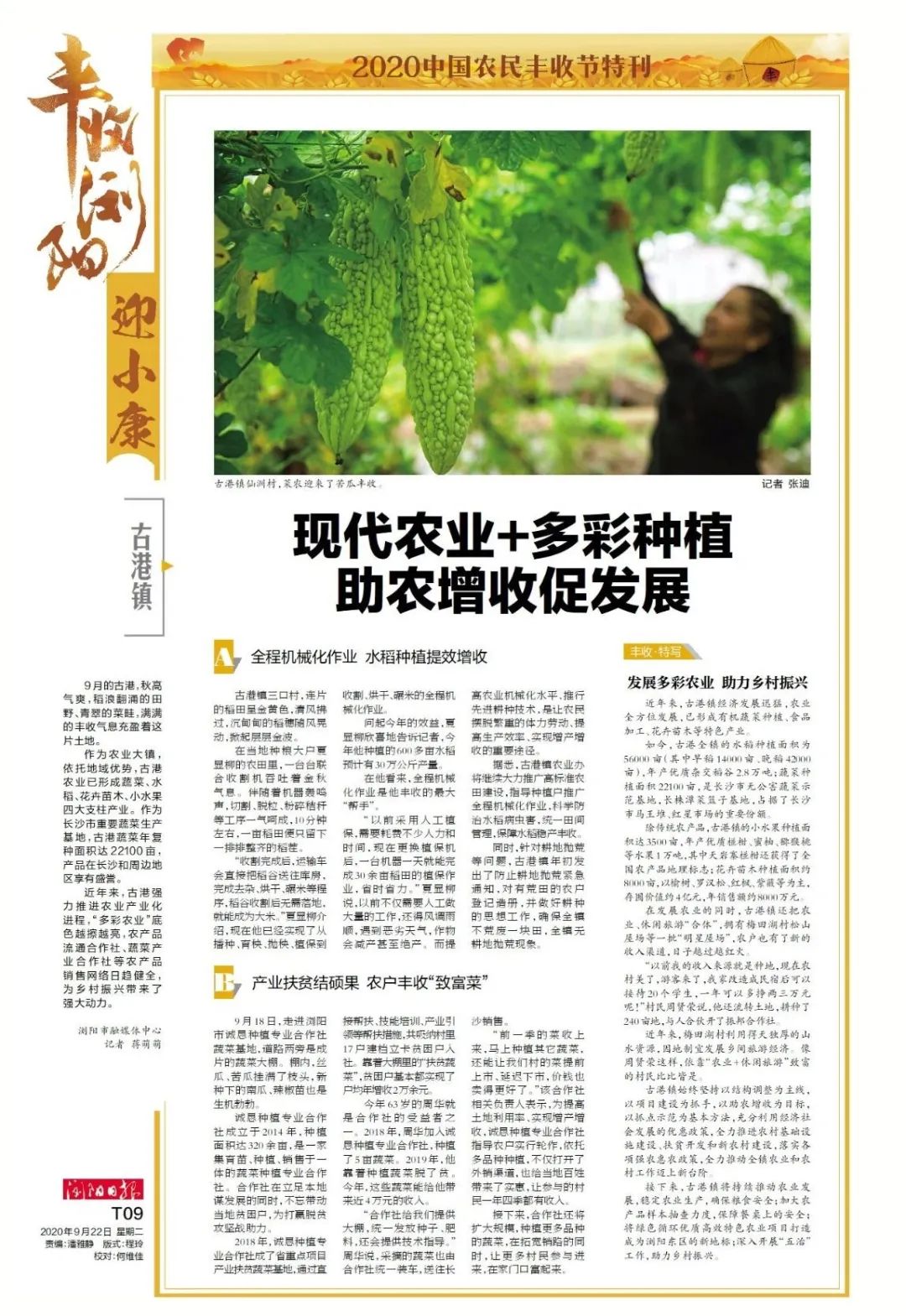 作为农业大镇,依托地域优势,古港农业已形成蔬菜、水稻、花卉苗木、小水果四大支柱产业。作为长沙市重要蔬菜生产基地,古港蔬菜年复种面积达22100亩,产品在长沙和周边地区享有盛誉。