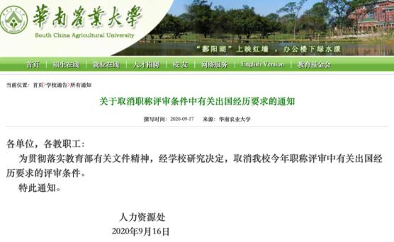 2020年9月17日,华南农业大学官网发布了《关于取消职称评审条件中有关出国经历要求的通知》,率先宣布取消职称评审中有关出国经历要求的评审条件。