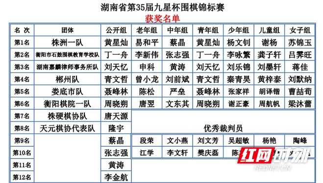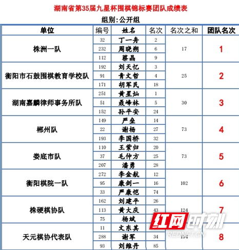 第35届“湘东棋院·九星杯”围棋锦标赛团体前8名龙虎榜。