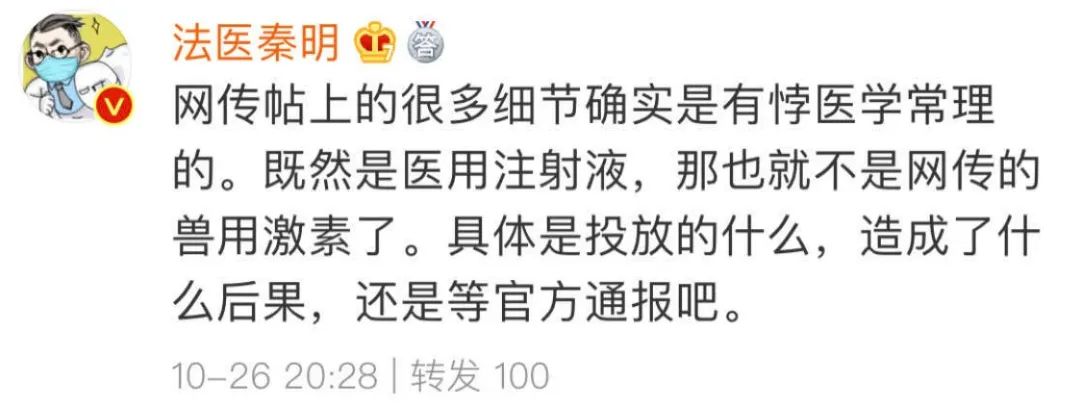 对此,安徽省公安厅副主任法医师@法医秦明表示:网传帖上的很多细节确实是有悖医学常理的。