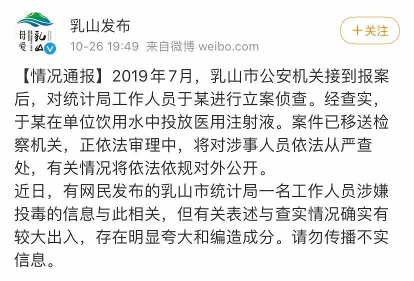 近日,有网民发布的乳山市统计局一名工作人员涉嫌投毒的信息与此相关,但有关表述与查实情况确实有较大出入,存在明显夸大和编造成分。请勿传播不实信息。