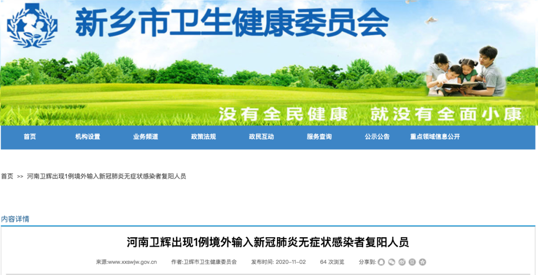 据河南省新乡市卫健委网站消息,11月2日,河南省卫辉市出现1例境外输入新冠肺炎无症状感染者复阳人员。