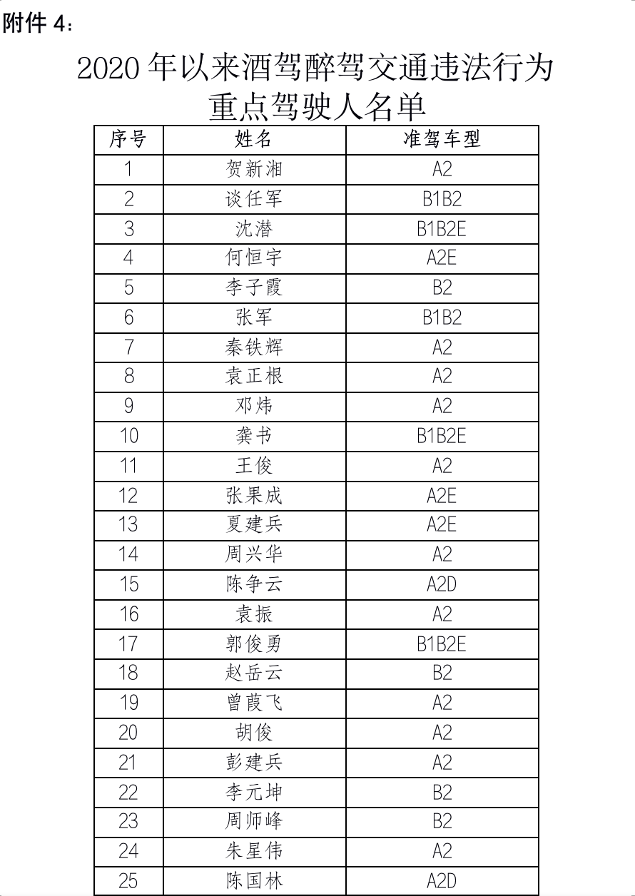 为加强重点车辆及驾驶人源头管理,切实消除道路交通安全隐患,根据湘潭市委办、市政府办《关于坚决整治道路交通安全顽瘴痼疾的通知》要求,市道安办对2020年以来有酒驾、醉驾、超员20%以上、超速50%(高速公路超速20%)以上交通违法行为及交通肇事重点车辆驾驶人进行了梳理核查。