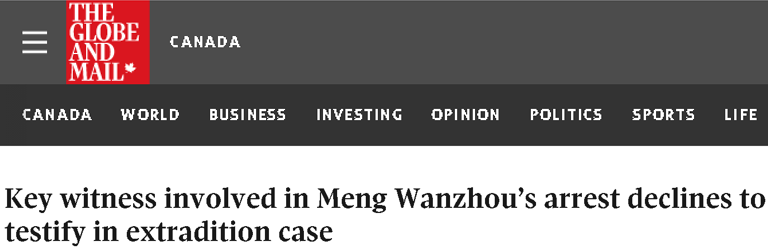 加拿大环球邮报11月16日报道标题《逮捕孟晚舟的关键证人不会在引渡案中作证》