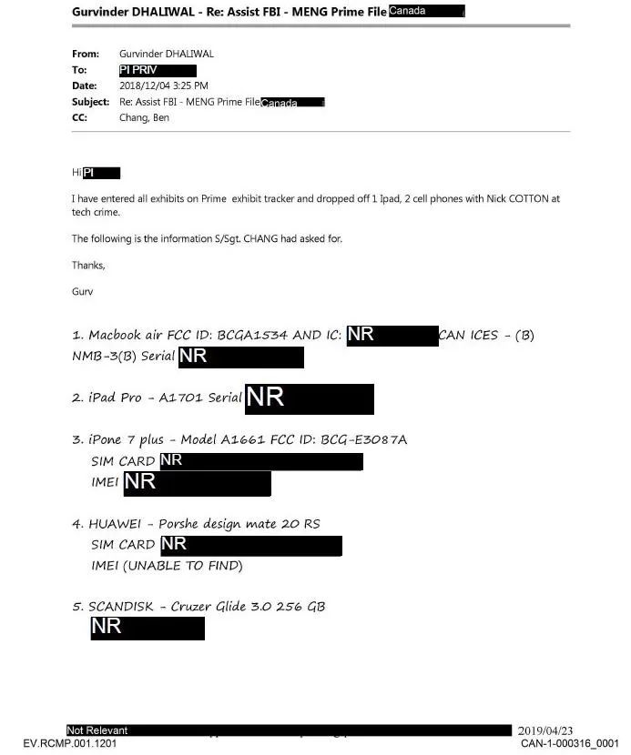 上图是2019年4月23日一封抄送张姓警长的电子邮件,主题是协助美国联邦调查局办理孟晚舟案,内容则是孟晚舟电子设备的信息,包括手机SIM卡号、电子设备系列号等等。