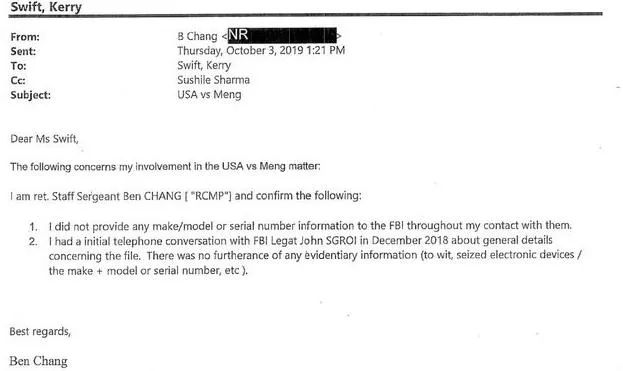 另一方面,尽管张姓警长并不承认是他把孟晚舟电子设备的信息交给了美国联邦调查局。然而,从他的同事范德尔·格拉夫(Vander Graaf )当时的工作笔记中,却存在与此事相关的记载。而且,还有一封邮件也可以证明,张姓警长在这个问题上明显撒谎。
