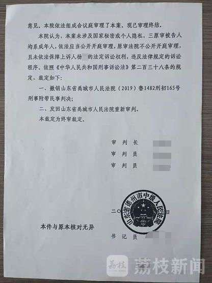 律师提供的《山东省德州市中级人民法院刑事附带民事裁定书》显示,该院认为,本案未涉及国家秘密或个人隐私,三原审被告人均系成年人,依法应当公开开庭审理,原一审法院不公开开庭审理,且未依法保障上诉人杨某的法定诉讼权利,违反法律规定的诉讼程序。德州中院据此撤销山东省禹城市人民法院(2019)鲁1482刑初165号刑事附带民事判决;发回山东省禹城市人民法院重新审判。该裁定书落款日期为2020年4月29日。
