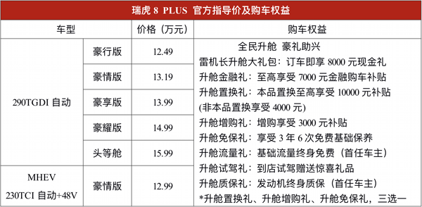 配置更豪华、舒适性更高的瑞虎8 PLUS将和瑞虎8形成“旗舰双爆款”,在满足消费者多元化和品质化出行需求的同时,以1+1>2的尖刀效应,向更高市场目标发起冲击。上市同时,奇瑞汽车为瑞虎8 PLUS车主精心准备了升舱金融礼、升舱置换礼、升舱增购礼等专属购车权益(详见下表)。