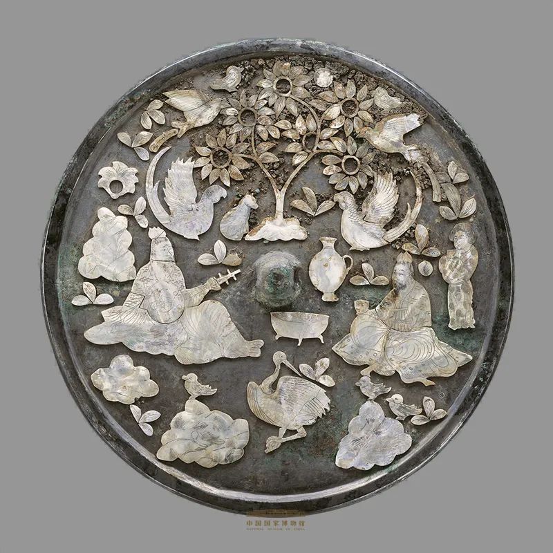 此镜镜背嵌螺钿刻画人物、树木、鸟鹊等。钮上方一株花树,树两侧各一振翅翘尾的鹦鹉。钮左侧端坐一人,手弹琵琶;右侧坐一人,手持酒盅,面前一鼎一壶,背后立一女侍,双手捧盒。钮下有仙鹤、水池,池内和池边有嬉戏的鹦鹉。