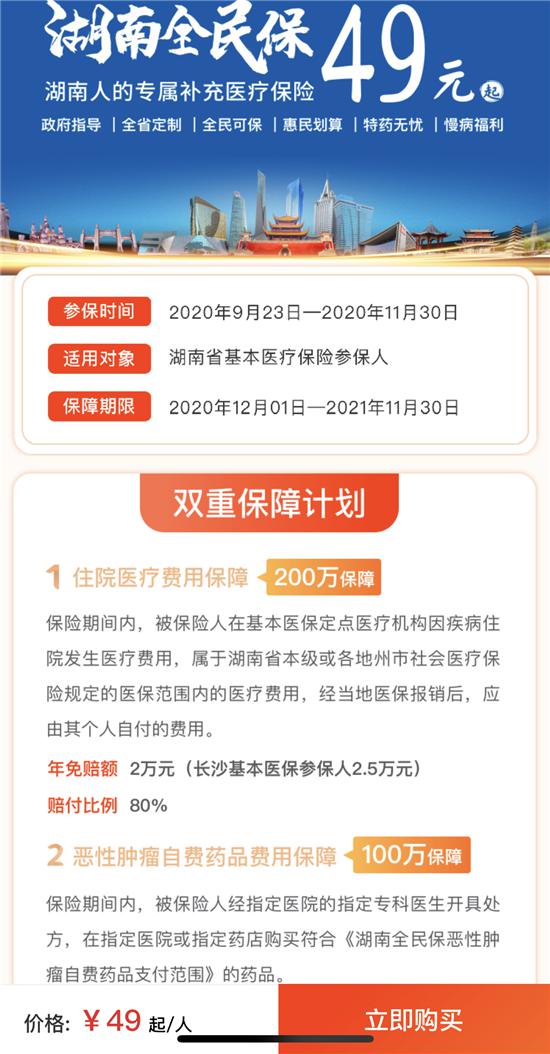 一年保费49元,保障额度超百万元,不限年龄、不限职业,不限健康状况……据“湖南全民保”公众号透露,自9月23日上线以来,已经有超过50万人投保。