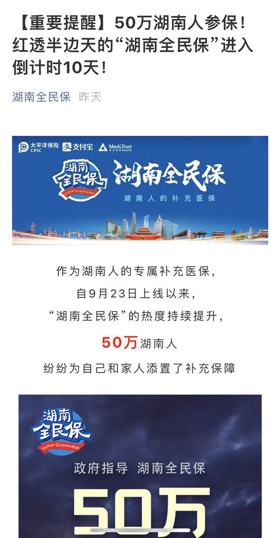 11月20日,“湖南全民保”微信公众号对外发布一条推文:【重要提醒】50万湖南人参保!红透半边天的“湖南全民保”进入倒计时10天!