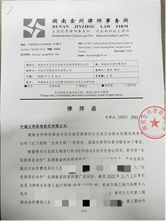 在湖南全民保自我推广的同时,一封律师函引发了业内的关注。这封律师函由湖南金州律师事务所代表中瑞万邦保险经纪有限公司(下称“中瑞万邦”)的合作方发出,发函日期为11月16日。作为湖南全民保的销售方,中瑞万邦未按约定及时足额向合作方支付宣传推广的合作费用,律师函中提到中瑞万邦的“合作方 " 即为承接湖南全民保宣传推广的湖南快乐至尚互动娱乐传媒有限公司(下称“至尚互娱”)。