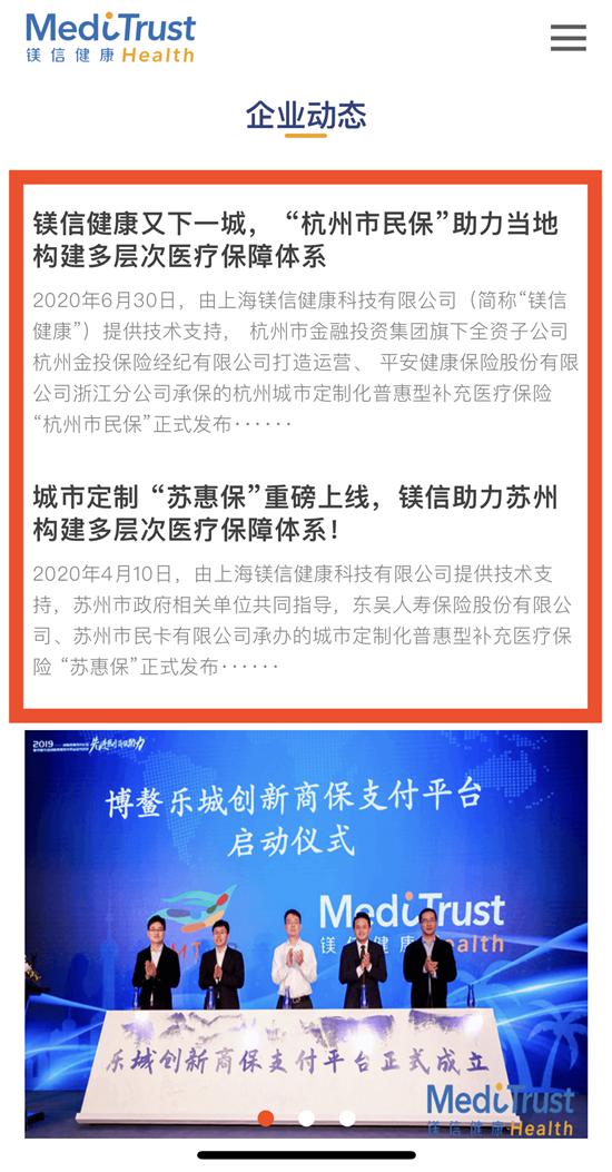 通过上海镁信官网,记者注意到,网站企业动态最新发布的两条消息分别为《镁信健康又下一城,“杭州市民保” 助力当地构建多层次医疗保障体系》、《城市定制“苏惠保”重磅上线,镁信助力苏州构建多层次医疗保障体系》,着力推介“杭州市民保”和“苏惠保”,称其为“城市定制化普惠型补充医疗保险”,这两款保险产品分别于今年6月30日和4月10日发布,此时上海镁信尚未全资控股中瑞万邦。在上述消息中,上海镁信均自称为产品的“技术支持”方。