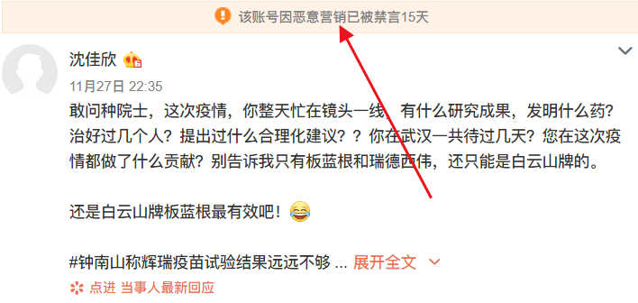 随后,新浪微博在沈佳欣上述微博上方标注“该账号因恶意营销已被禁言15天”。