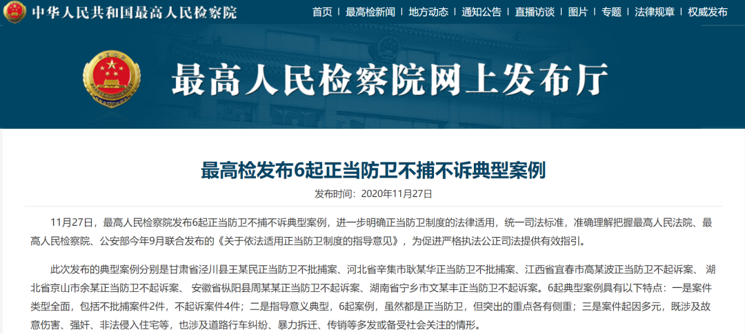 11月27日,最高人民检察院发布6起正当防卫不捕不诉典型案例。安徽省枞阳县周某某正当防卫不起诉案在列。
